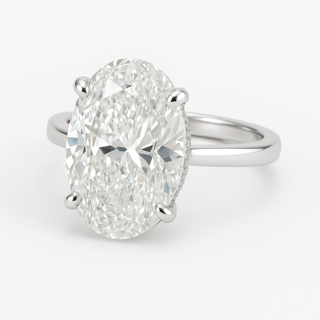 Refined and timeless, this 5.71-carat oval diamond is crafted for those who appreciate understated luxury. The VS1-F lab-grown diamond is set in platinum, featuring a delicate hidden halo that adds a soft shimmer beneath the center stone. Elegant from every angle, with an appraised value of $10,500, this design captures both classic beauty and modern sophistication.
