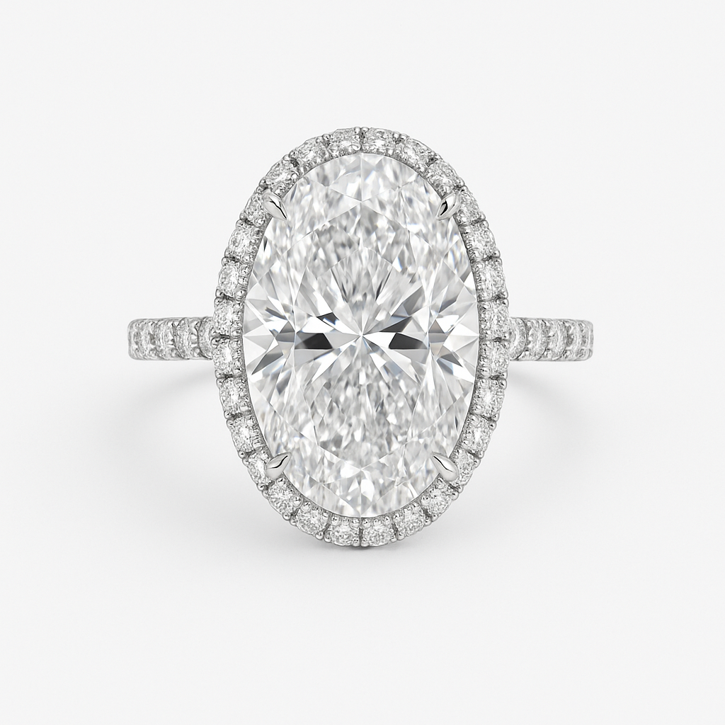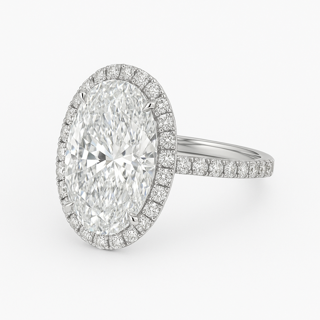 Radiant and sophisticated, this 6-carat oval diamond is the centerpiece of a timeless design. The VVS2-E lab-grown diamond is set in 14K white gold, encircled by a delicate halo of accent diamonds that enhances its brilliance and presence. Elegant and enduring, this piece captures the perfect balance of classic beauty and modern refinement.