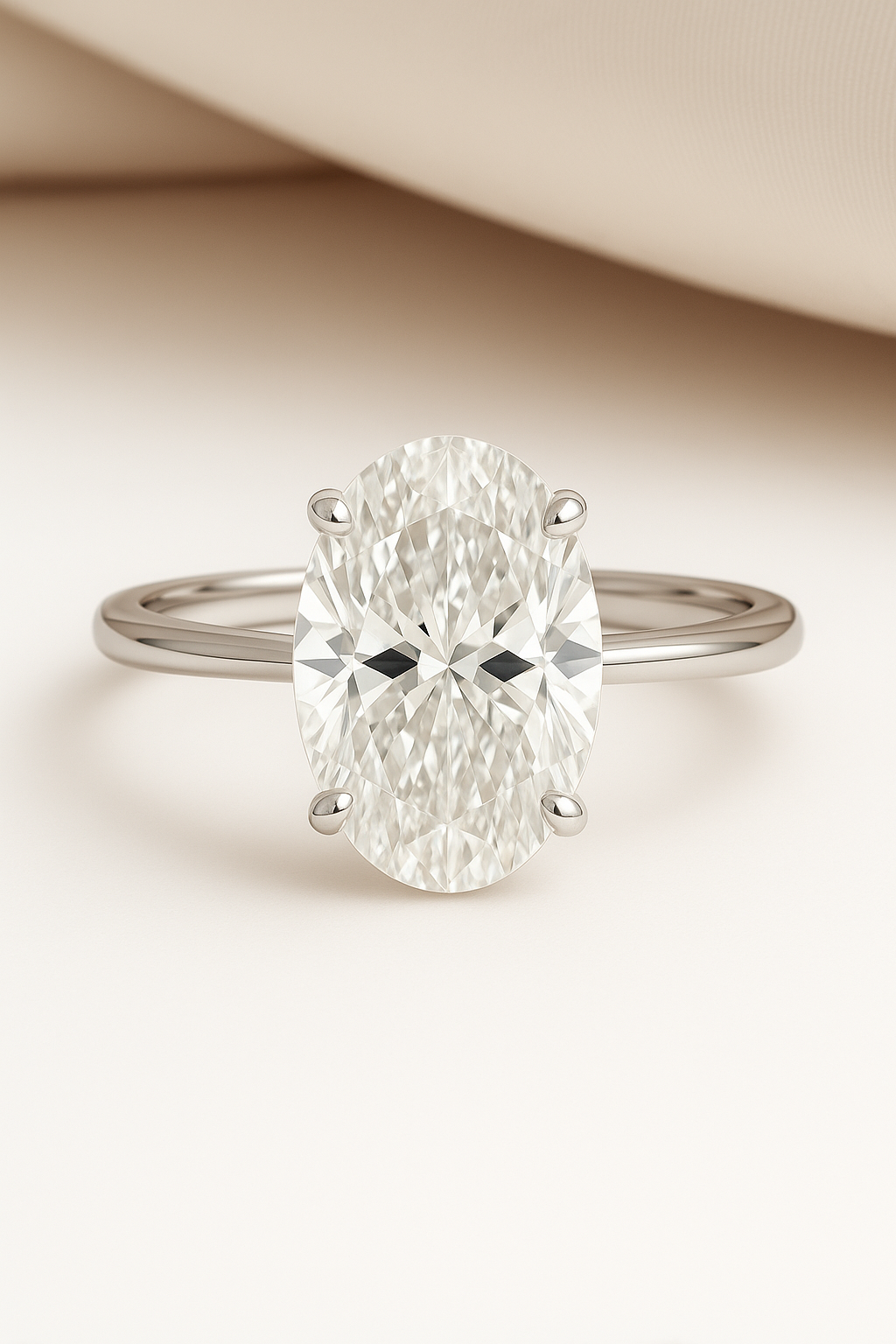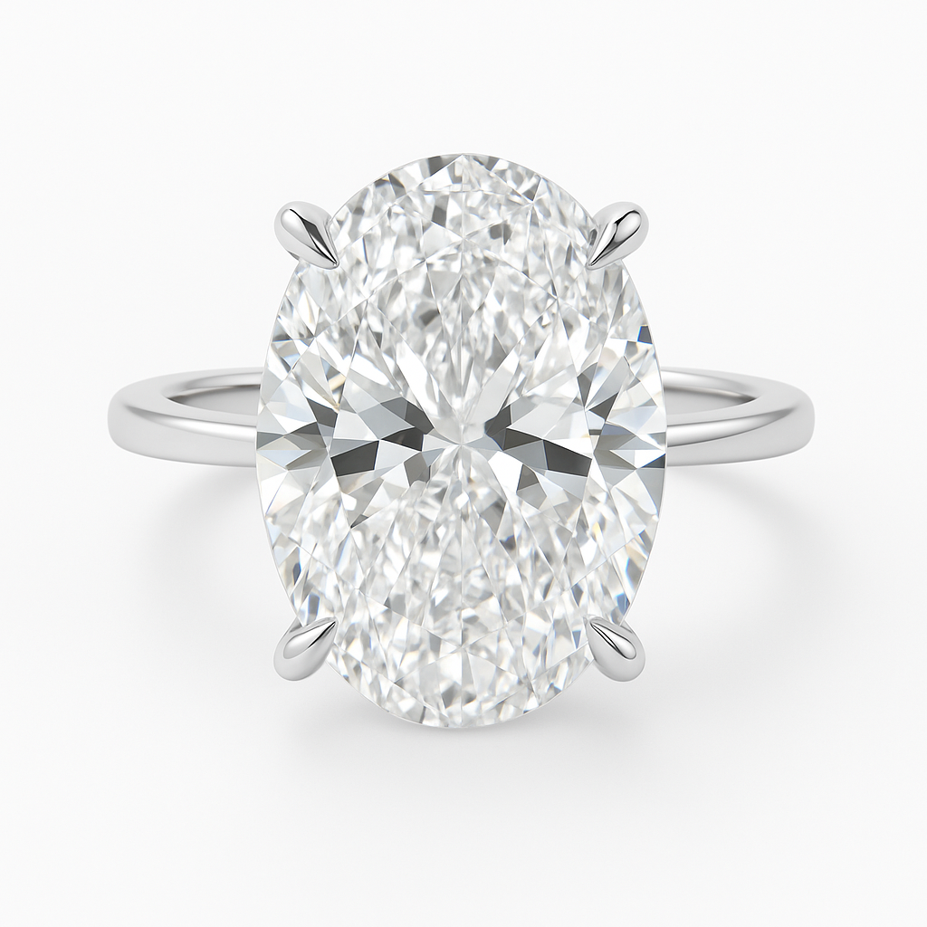 Effortlessly elegant, this 7.08-carat oval diamond ring is a masterpiece of refined simplicity. The VVS2-E lab-grown diamond captures light with extraordinary brilliance, showcased in a sleek 14K white gold setting with a hidden eternity band that adds a touch of modern sophistication. A timeless design that balances bold presence with graceful minimalism.